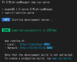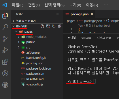 'package.json'파일이 있는 위치는 'JSH-VUE > pages > 'package.json'인데,