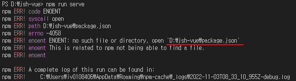 현재 위치는 'JSH-VUE'에서 실행했므로 파일을 못찾는것은 당연한 일