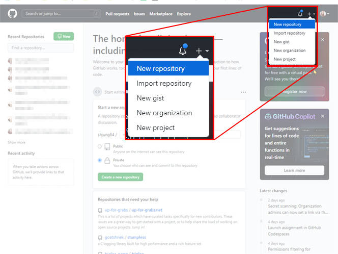 상단에 ' + > New Repository'로 들어간다.