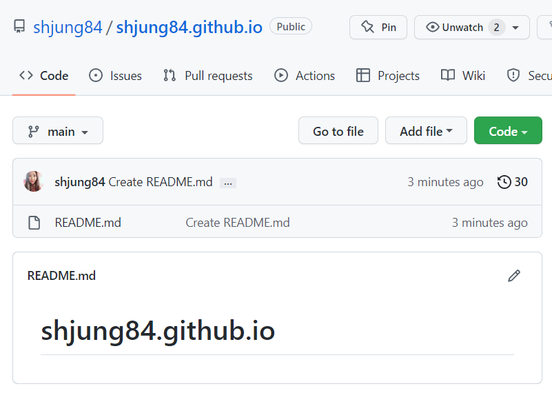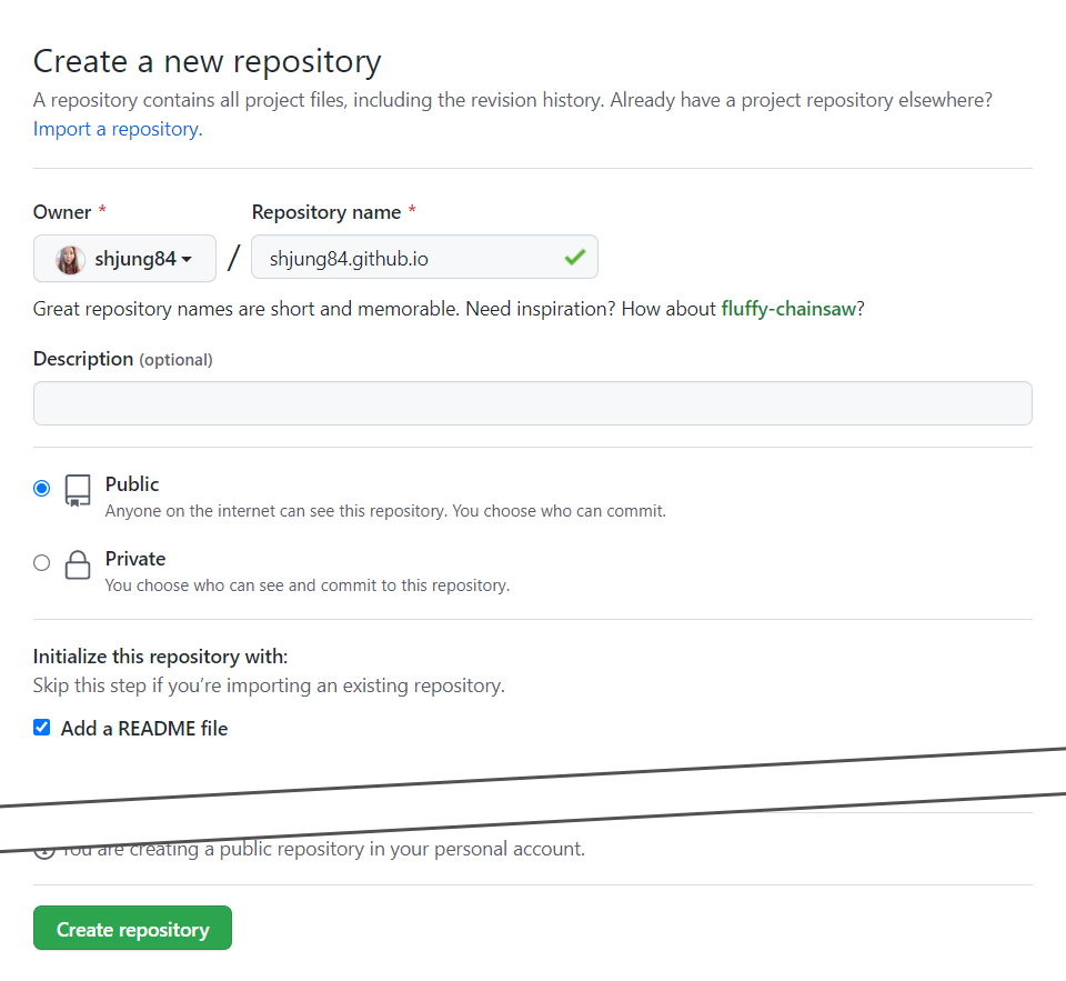 자신의 사이트로 사용할 리파지토리명은 아이디와 똑같이 넣어 줘야 한다.