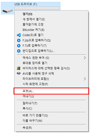 대상USB에 다시 마우스 우클릭으로 '포맷'을 들어간다.