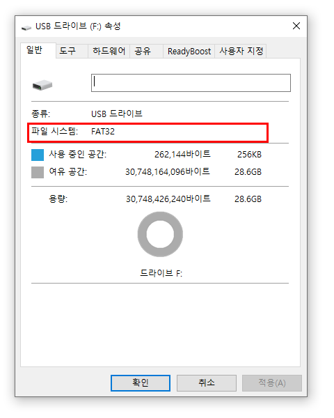 USB의 파일 시스템을보면 형식이 'FAT32'로 되어있다.