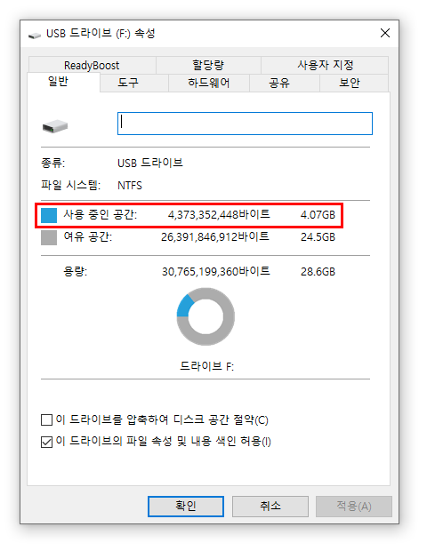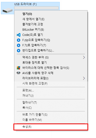 대상USB에 마우스 우클릭으로 '속성'에 들어간다.