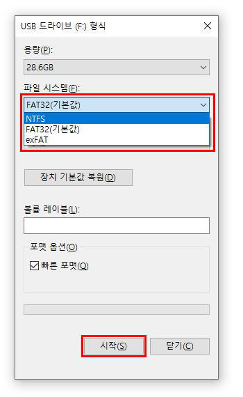 파일시스템의 형식을 'NTFS'로 지정 해주고 '시작'버튼