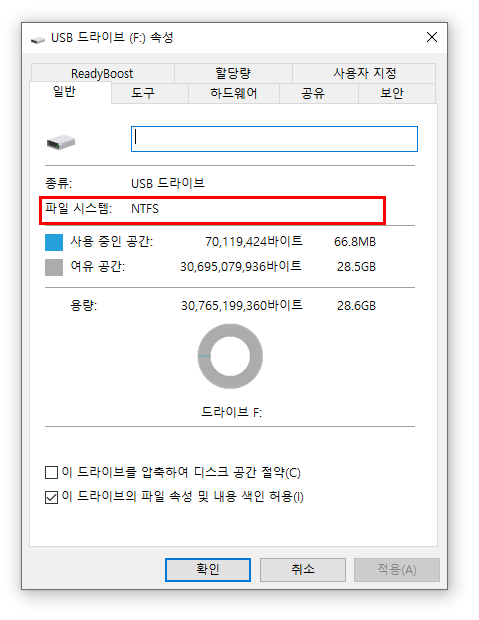 파일 시스템이 'NTFS'로 변경 됨