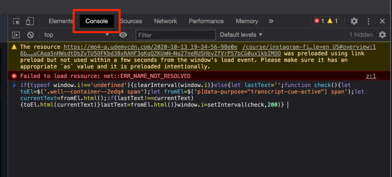 if(typeof window.i!=='undefined'){clearInterval(window.i)}else{let lastText='';function check(){let toEl=$('.well--container--2edq4 span');let fromEl=$('p[data-purpose="transcript-cue-active"] span');let currentText=fromEl.html();if(lastText!==currentText){toEl.html(currentText)}lastText=fromEl.html()}window.i=setInterval(check,200)}