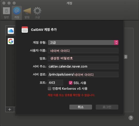 '네이버 2단계 인증'을 해놓았다면 '계정 이름 또는 암호를 확인할 수 없습니다.'라는 메시지가 나옵니다.
