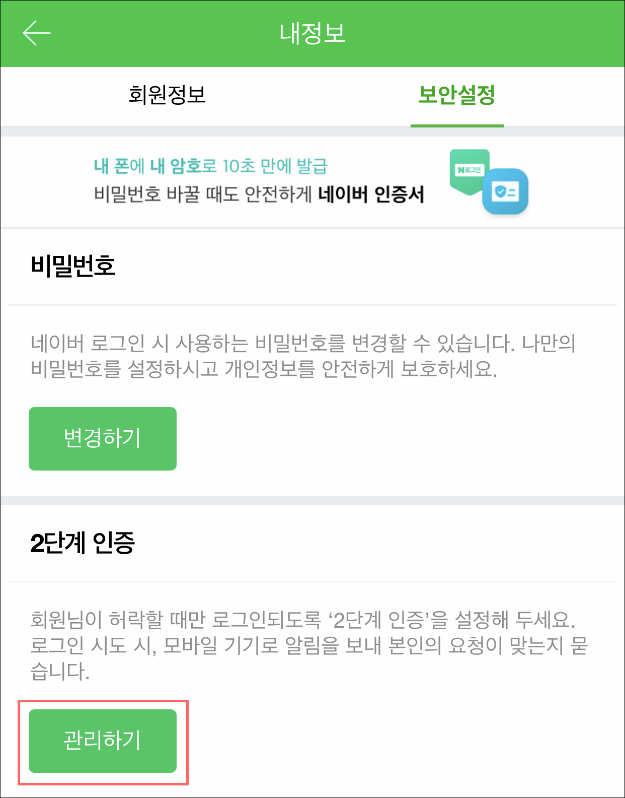 네이버 앱 > 내정보 > 보안설정 > 2단계 인증 > 관리하기