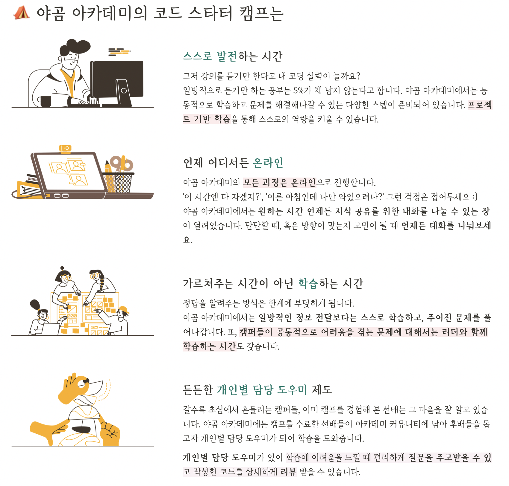 이유있는 코드가 시작되는 곳, 야곰 아카데미입니다. 개발자 커리어를 시작하기 위한 부트캠프를 운영하고 있습니다.